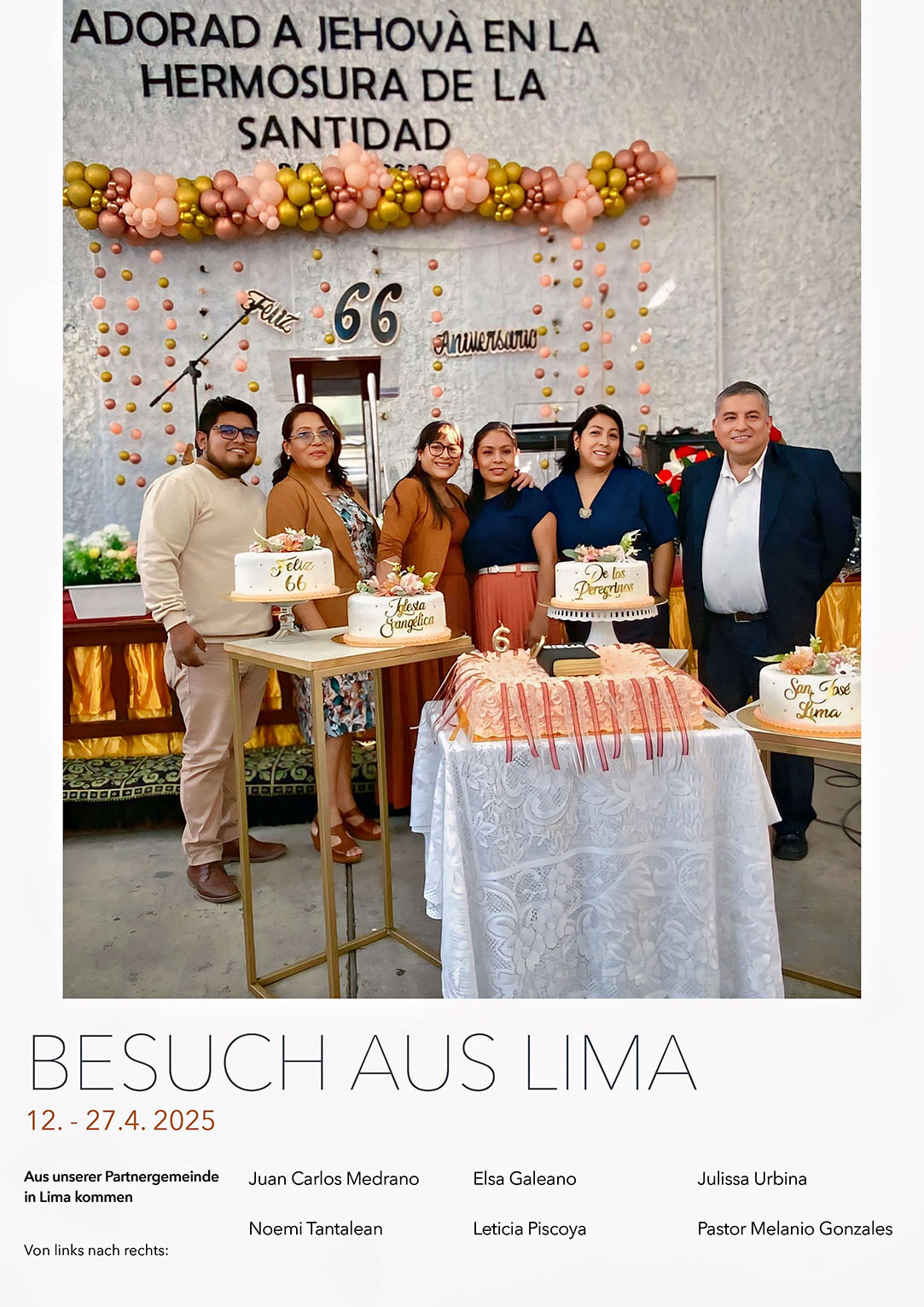 In diesem Jahr kamen daher Pastor Melanio Gonzales mit Juslissa Urbina, Leticia Piscoya, Noemi Tantalean, Elsa Galenao und Juan Carlos Medrano in der Zeit um Ostern zu uns nach Menden. Mit einem umfangreichen Programm von Gottesdiensten, Erfahrungsaustausch und Freizeitaktivitäten sollten die Gäste aus Peru das Leben unserer Gemeinde in Menden kennenlernen.