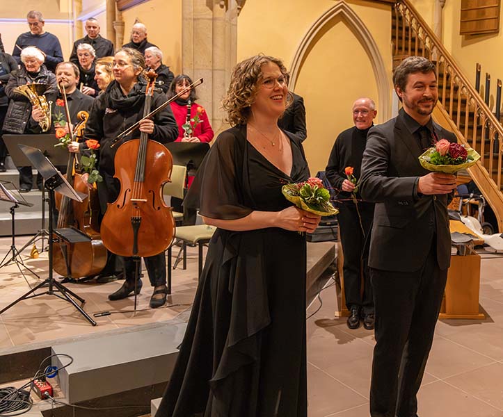 Letzteres gilt naturgemäß für die Solisten: Meike Buchbinder (Sopran) und Robin Grunwald (Bariton). Wunderschön wurden ihre Arien von ihnen gesungen und ich habe das Zuhören genossen. Zum Glück können wir Choristen in der Gemeinschaft singen, uns gegenseitig stützen, uns sicherer fühlen durch alle, die zum Zusammenklang beitragen. Aber das Chorsingen birgt auch besondere Schwierigkeiten: Es kommt auf absolute Präzision an, damit es im Gesamtklang nicht „klappert“ oder die Stimmen sogar durcheinandergeraten. Zudem muss die Intonation stimmen: Alle müssen exakt dieselben Töne in ihrer Stimme singen