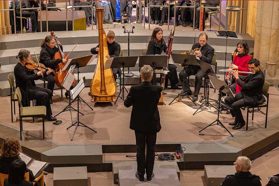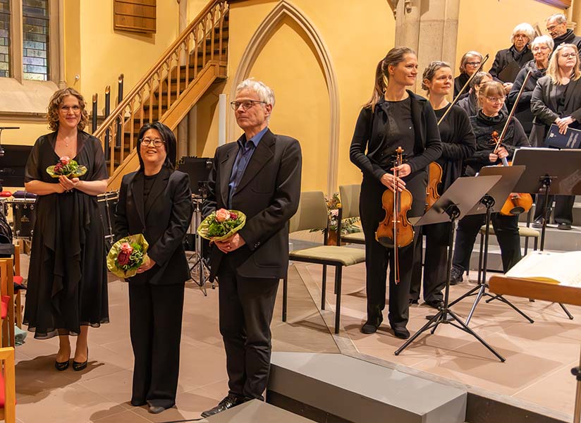 Eine solche Orgelfassung erklang 2017 in der Heilig-Geist-Kirche, damals unter dem Kantor Helmut Brandt. Unsere neue Kantorin Wakako Yamanaga hat sich bewusst für die „kleine“ Orchesterfassung entschieden und dafür das Ensemble „Horizonte“ mit 10 verschiedenen Instrumenten engagiert. Es gab also keine Dopplung von Instrumenten. Jeder Musiker war allein für seinen Part verantwortlich.