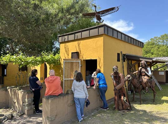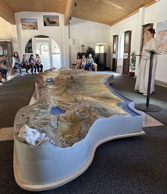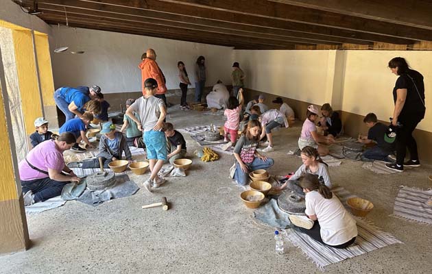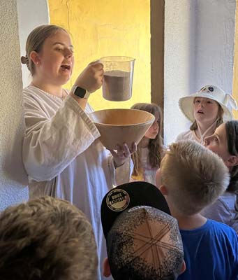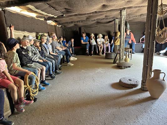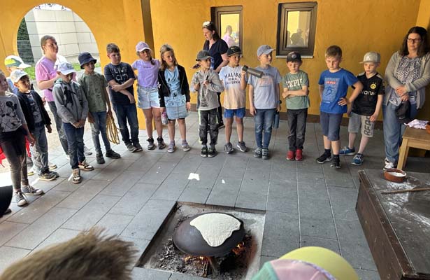 Die Kinder erlebten im Bibeldorf, wie das Alltagsleben vor und nach Jesu Geburt ausgesehen hat. Viele interessante Dinge gab es zu entdecken: das Nomadenzelt, die Ausgrabungsstätte, das Römerlager oder das Einraumhaus, in dem laut Bibel ein Gelähmter zu Jesus herabgelassen wurde, um geheilt zu werden. Anhand einer übergroßen Landkarte lernten sie die Geographie Israels kennen. Besonders spannend war es für die Kinder, das Handwerk von damals selbst auszuprobieren. Sie stellten ein Seil, einen Holzhammer und Kräutersalz her. Auch beim Mehlmahlen zeigten sie Geschick und Ausdauer. Die Synagoge, der religiöse Mittelpunkt der damaligen Dörfer, war Treffpunkt am Ende des dreistündigen Rundgangs. In anschaulicher Weise wurde hier der Sabbat, der höchste jüdische Feiertag, erklärt. Auf Gemeinsamkeiten und Unterschiede zum Sonntag als christlichem Ruhetag, wurde kindgerecht eingegangen.