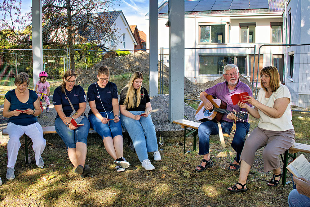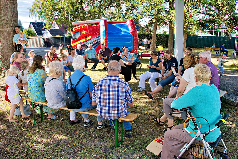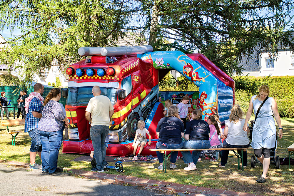 Im Anschluss erwartete die Teilnehmenden ein buntes Programm, das für jede Altersgruppe etwas bereithielt. Besonders die Kinder kamen auf ihre Kosten: Die Feuerwehr-Hüpfburg war ein absoluter Magnet, ebenso der Soccer Court, der Medienwagen und ein Reaktionstisch, die viele Neugierige anzogen. Auch das Glücksrad der Ev. Jugendhilfe und das Kinderschminken vom CVJM sorgten für leuchtende Augen. Das gemeinsame Singen unter dem Glockenturm war ein Moment, der Verbundenheit und Leichtigkeit spürbar machte.