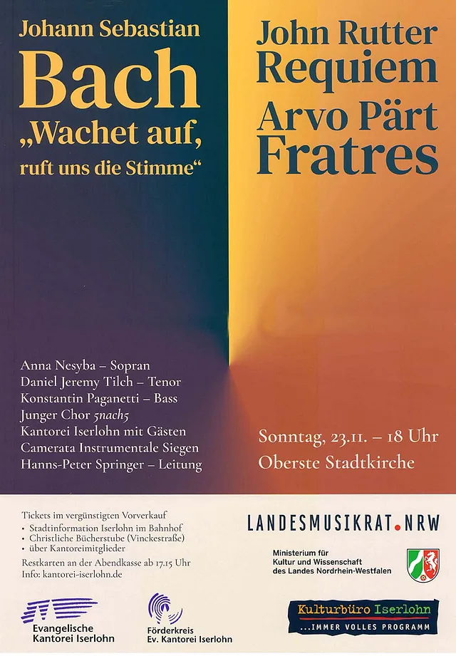 Auf dem Programm stehen u.a. das „Requiem“ von Gabriel Fauré, „Dona nobis pacem“ von Jörg Peter Mittmann sowie ein Werk von Edward Elgar. Faurés „Requiem“ drückt Trost und Hoffnung auf die Ewigkeit aus und passt damit besonders gut zum Thema des Konzerts: „Lux Aeterna – Das ewige Licht“. Begleitet wird die Kantorei vom international anerkannten Ensemble Horizonte. Als Solisten wirken Meike Buchbinder (Sopran) und Robin Grunwald (Bariton) mit.