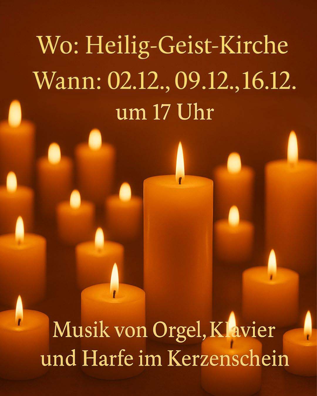 Es erwartet Sie eine halbe Stunde Musik bei Kerzenschein. Im Anschluss gibt es Tee und Plätzchen.Wir freuen uns auf Ihren Besuch.